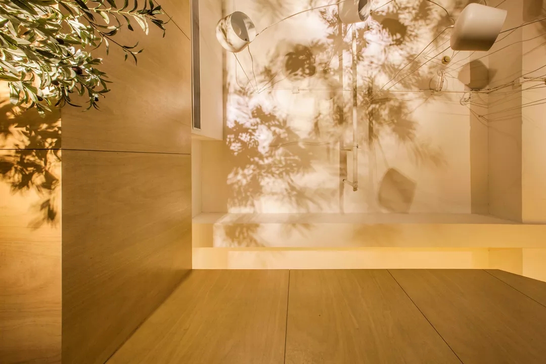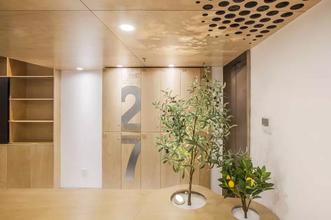 功能融于樂趣與創(chuàng)意,兩個(gè)空調(diào)的回風(fēng)孔也不能放過,市面上的百葉口為了實(shí)用而完全無法融入環(huán)境。由于吊頂也屬于木質(zhì)體塊,所以經(jīng)過試驗(yàn),一個(gè)充滿漸變的點(diǎn)陣圖形,解決了這個(gè)問題,不同規(guī)格的開孔器進(jìn)過精心布置并開洞,讓空間回歸純粹與樂趣。