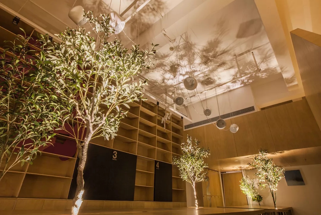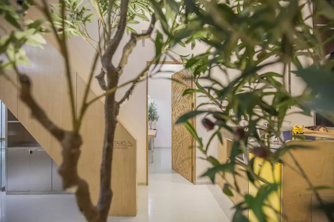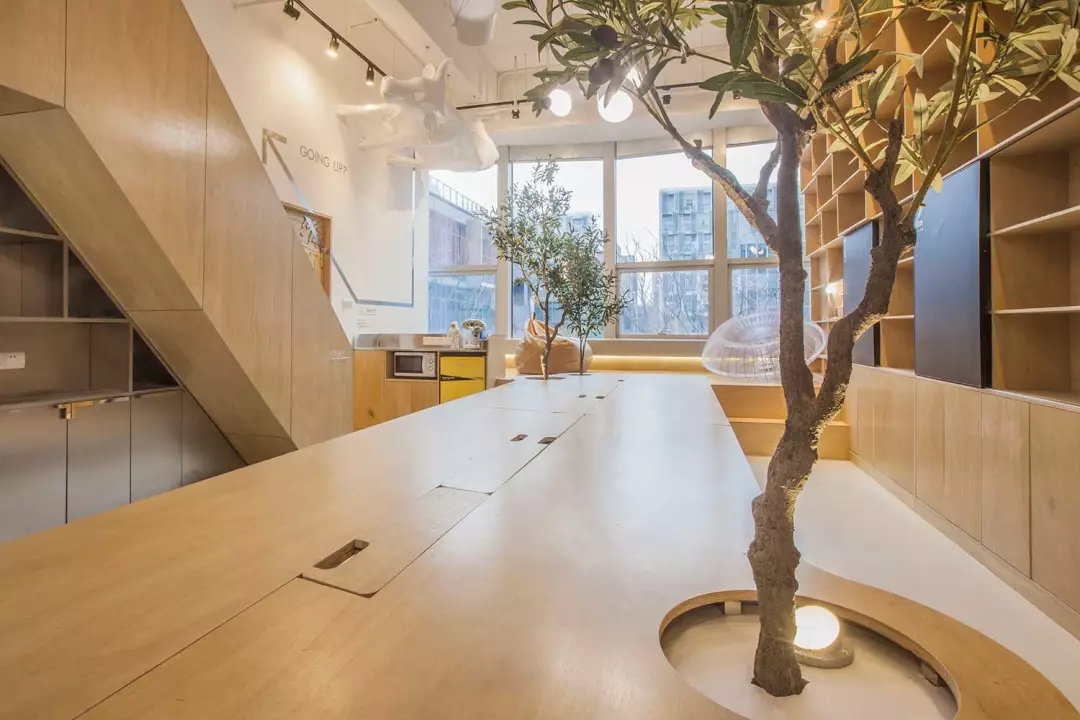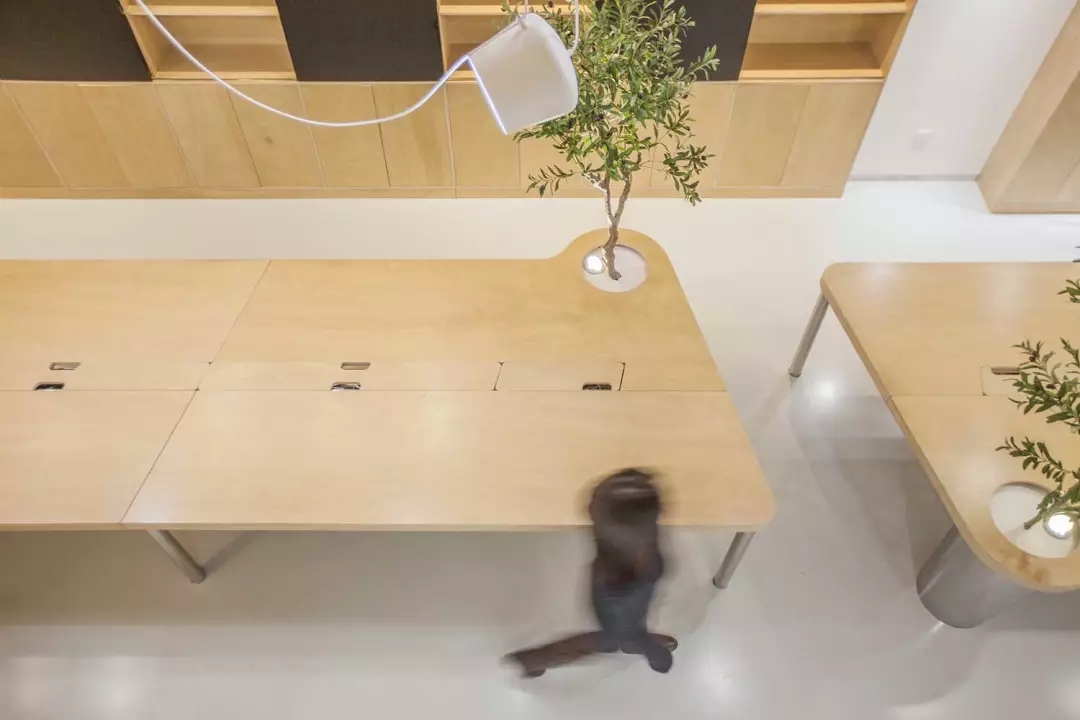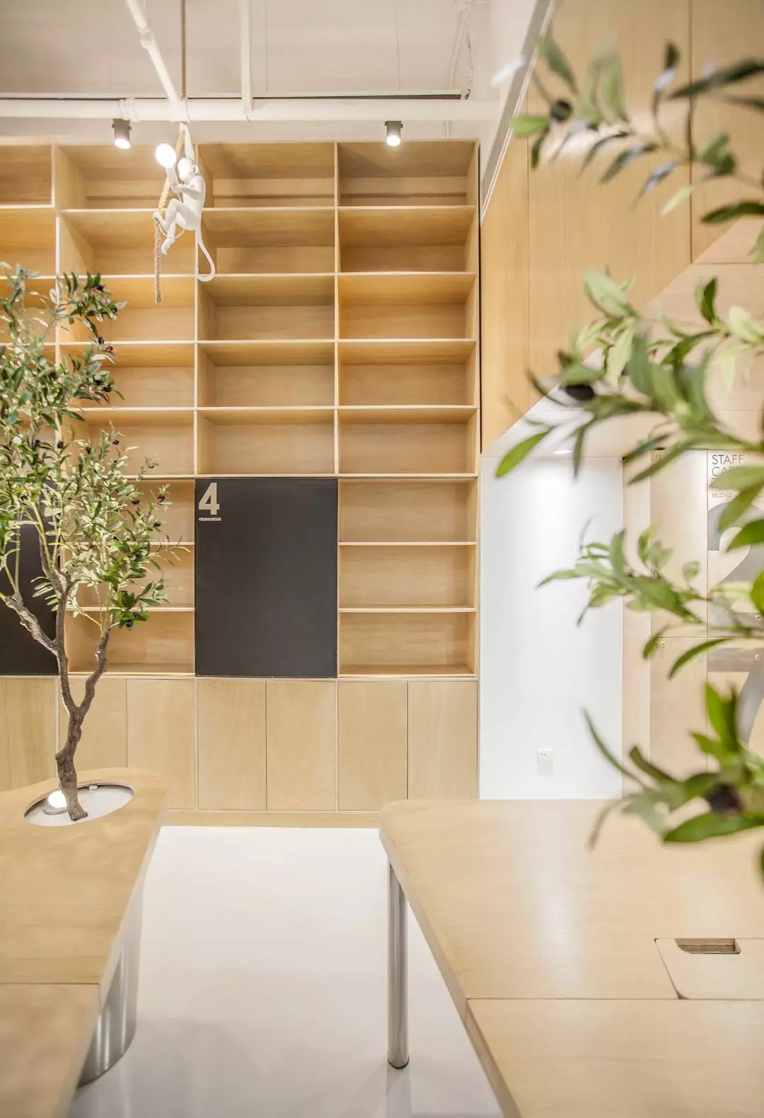 辦公桌與樹的結(jié)合,成為了整個(gè)空間的內(nèi)景觀,也與外面的綠色形成呼應(yīng),消減以往辦公的緊張氛圍。整墻的書架也不甘無趣,在實(shí)用的框架下,產(chǎn)生一絲波動(dòng)的起伏,如同山崖,如同坡面。