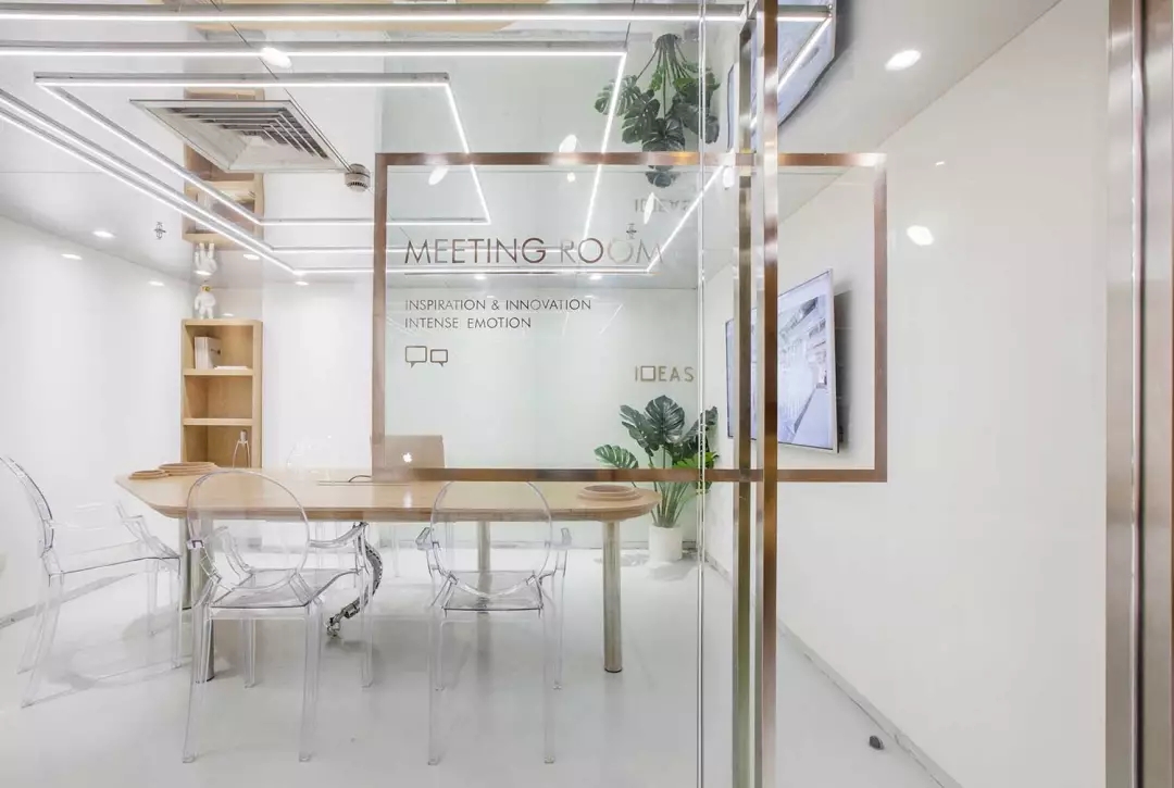 由于層高的限制,會(huì)議室感覺比較壓抑,所以將整個(gè)天花變?yōu)殓R面,化解的層高的局限,也讓空間感別具一格.但是空調(diào)的出風(fēng)散流器非常扎眼,空調(diào)的位置決定了風(fēng)口位置無法移動(dòng)。而市面上又找不來合適的可以符號(hào)化的替代品,于是,就順勢(shì)而為,將會(huì)議室的照明以散流器為中心進(jìn)行布置,讓散流器的方框與燈光呼應(yīng)起來,形成了會(huì)議室有意思的圖形。