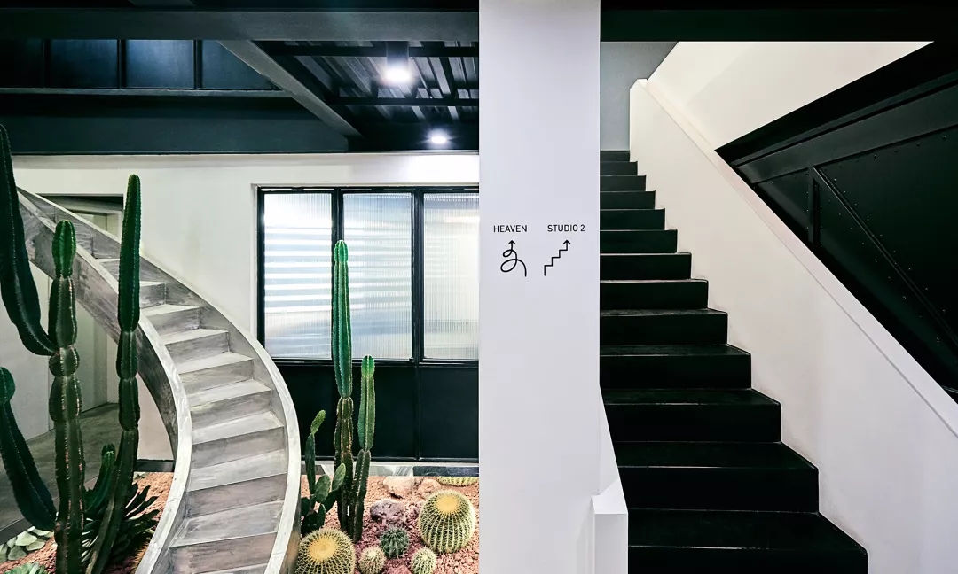 ASTUDIO攝影工作室位于CBD東側(cè)菁英谷文創(chuàng)園內(nèi),整體的設(shè)計(jì)風(fēng)格融合了粗狂工業(yè)風(fēng)和現(xiàn)代簡(jiǎn)約風(fēng)。原有建筑為雙層的廠房空間,這種大空間非常適合拍攝的需求。攝影師希望把這個(gè)大空間改造為兩個(gè)相對(duì)獨(dú)立的拍攝區(qū),并且有各自獨(dú)立的化妝間和出入口,從而可以同時(shí)進(jìn)行兩場(chǎng)獨(dú)立的拍攝。UUA將原有的二層建筑在豎向上改造成為了三層的空間,其中第一層包含接待區(qū)和1號(hào)拍攝區(qū),第二層整體為辦公空間,第三層是2號(hào)拍攝區(qū),這種豎向上的分區(qū)保障了兩場(chǎng)同時(shí)拍攝的獨(dú)立性。