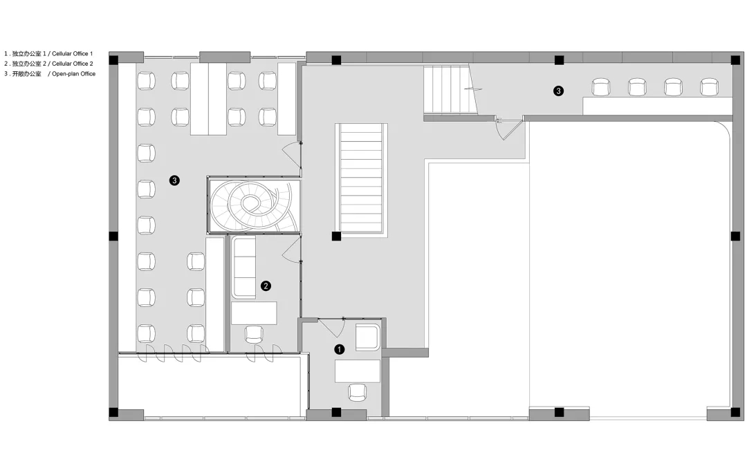 ASTUDIO攝影工作室是一個(gè)多功能的復(fù)合空間,UUA把拍攝、化妝、接待、辦公、會(huì)議、休閑等多種功能有機(jī)地融合在這個(gè)通高的廠房之中,空間緊湊又富于變化。拍攝區(qū)為最重要的功能單元,由于需要足夠的長(zhǎng)寬高空間來滿足設(shè)置無影墻、布景布光以及拍攝距離等需求,所以設(shè)計(jì)師將一層的一半劃歸為1號(hào)拍攝區(qū),保留雙層通高的空間形式;另一半則加建出雙層空間,其中一層作為接待,二層作為辦公。廠房的三層因?yàn)樵揪哂凶銐虻膶痈撸虼吮辉O(shè)置為2號(hào)拍攝區(qū)。