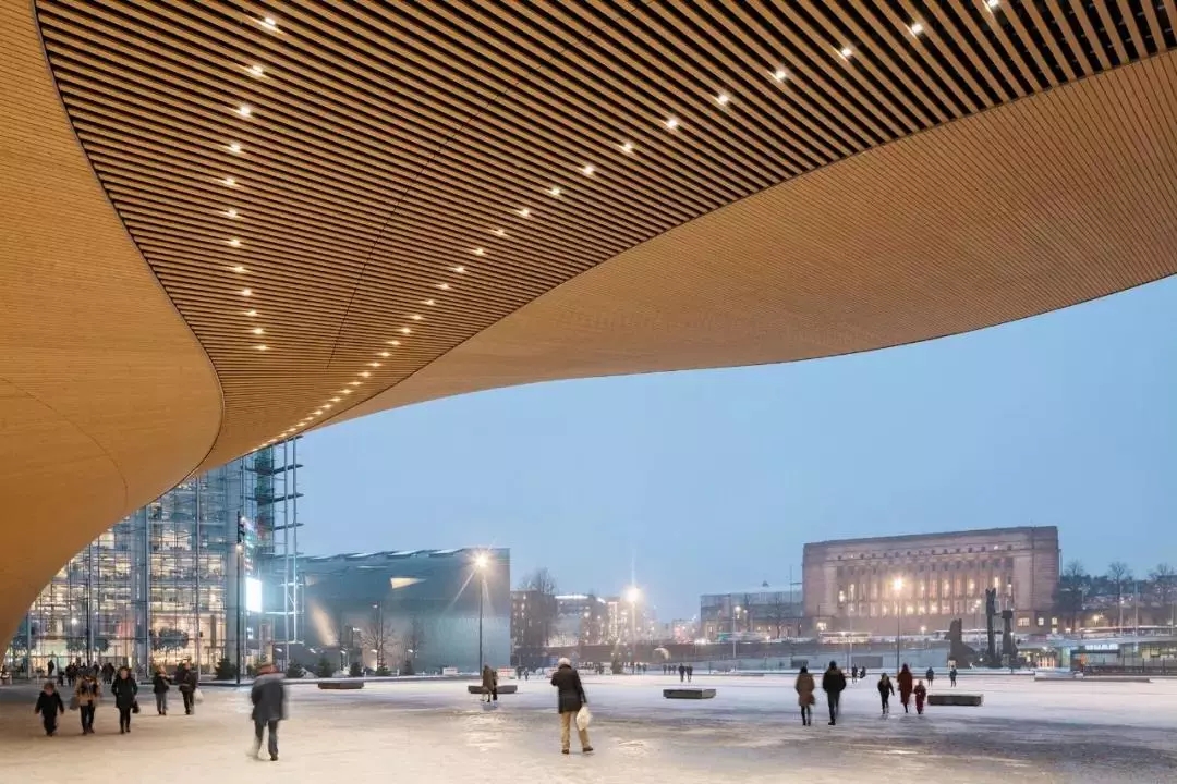 但其實據(jù)設(shè)計頌歌的主建筑師之一南安迪(Antti Nousjoki)講,靈感的出發(fā)點,還是在于考慮它的功能。作為一個地處赫爾辛基市中心,毗鄰熱鬧商圈、火車站和美術(shù)館的公共空間,能夠給市民們帶來什么樣的服務(wù)?又能填補(bǔ)哪些缺失的城市設(shè)施?