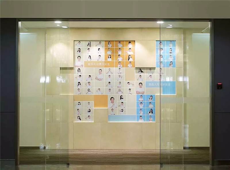 這幾張圖比較直觀的說明了第一類、第二類內(nèi)容與公司的企業(yè)文化相關。例如公司的文化展墻、發(fā)展歷史展示、榮譽展示部門的團建、玻璃隔墻的貼膜裝飾墻面柱體以及部分多媒體科技展示等內(nèi)容相對比較多,也是屬于辦公空間裝修中的環(huán)境圖形的設計范疇。