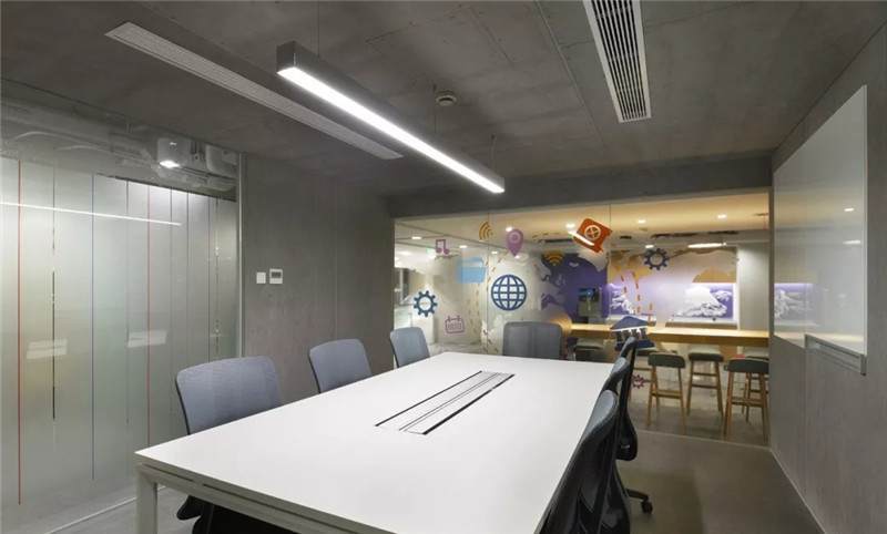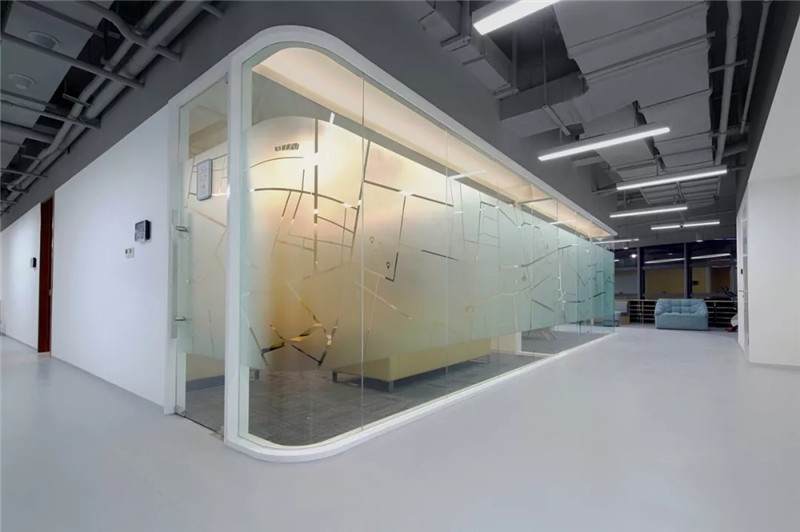 第二張中可以看到,桌上足球,這一張是會議室的玻璃貼膜,最初設計的都是一些彩色的圓點,但是做完后太通透,起不到遮擋作用,所以現(xiàn)場臨時在玻璃的內(nèi)側又加了大型的磨砂圓,就有兩層疊加到一起的圖形,磨砂與色彩組合在一起,效果豐富有層次。