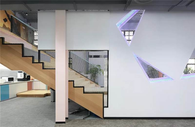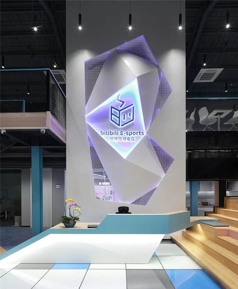前臺接待區(qū)利用建筑結(jié)構(gòu)挑空空間的優(yōu)勢,塑造9米高的具有未來雕塑造型藝術(shù)感的LOGO背景墻,結(jié)構(gòu)形態(tài)上,設(shè)計師運用B站文化中的創(chuàng)意與元素,中間由三維立體幾何造型與鐵絲網(wǎng)拼接而成,配以藍色燈光,彰顯公司文化的同時呈現(xiàn)電競的科技感,使得整體背景墻,體量和形態(tài)上給往來訪客和員工強烈的視覺沖擊感。