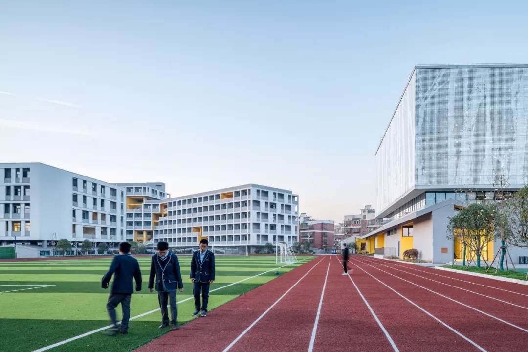由零壹城市建筑事務(wù)所(LYCS Architecture)從2016年開始設(shè)計(jì)的義烏新世紀(jì)外國(guó)語學(xué)校如今已投入使用,也剛結(jié)束了它的第一學(xué)期。這個(gè)位于浙江省義烏市主城區(qū)的學(xué)校是杭州新世紀(jì)外國(guó)語學(xué)校的分校,共有48個(gè)班的小學(xué)與24個(gè)班的初中。它作為僑商回國(guó)的開篇之作,也是零壹城市一直以來持續(xù)關(guān)注與探究的高密度城市與教學(xué)空間設(shè)計(jì)問題的典型實(shí)踐之一。