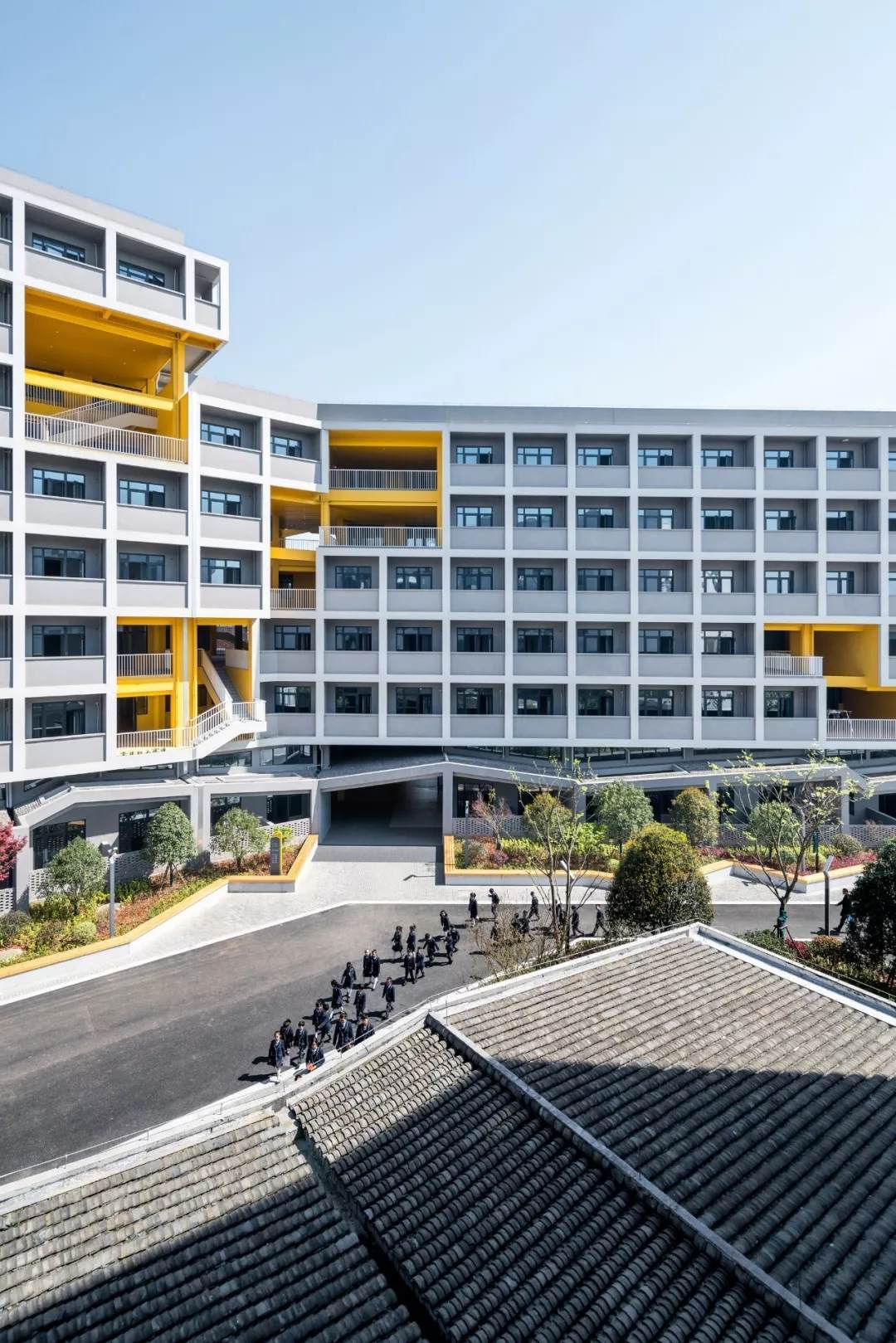 校園首層裙房的折面屋頂鋪滿了小青瓦,是中國(guó)傳統(tǒng)建筑中最常見的一種材料之一。從上層建筑向外眺望就可以看到,瓦片不僅起到建筑屋面保溫防水的作用,還為整個(gè)校園帶來了一份優(yōu)雅和淡然。