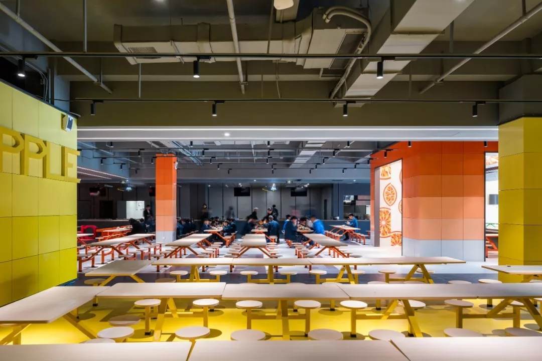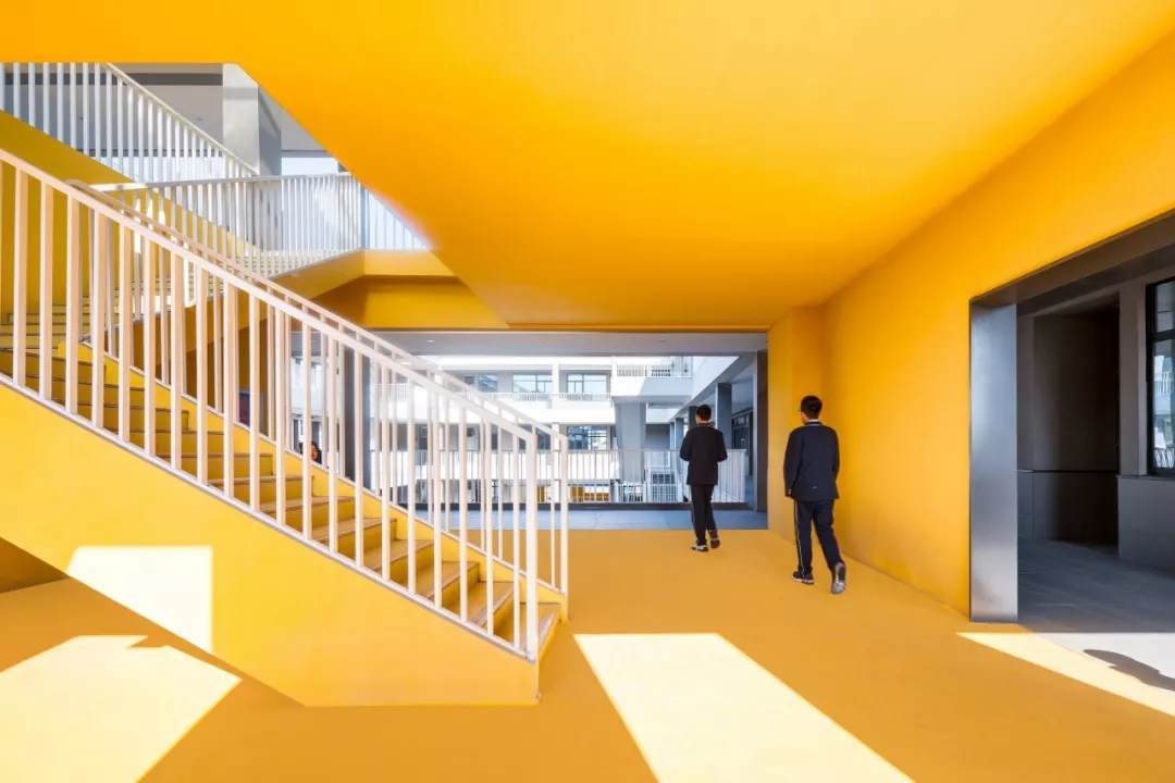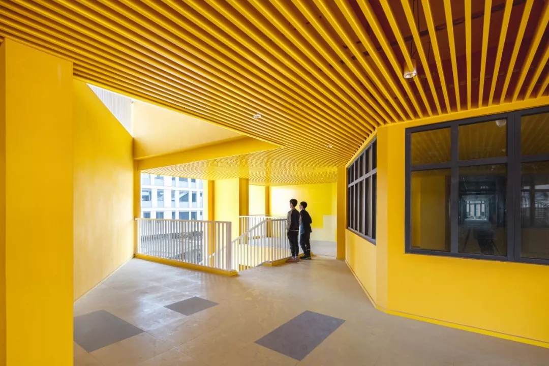 此外,設(shè)計(jì)在教室與地面集中活動(dòng)場(chǎng)地之間創(chuàng)造了中間層級(jí)的活動(dòng)場(chǎng)地,讓課間短暫的時(shí)間也能讓學(xué)生充分玩耍。把教學(xué)樓和宿舍樓局部的體塊掏空形成半開放的活動(dòng)空間,將掏空與開洞這種二維的建筑元素增加了一維,表面上看是把原有的實(shí)體空間減少了一部分,實(shí)則掏空的部分成為了學(xué)生課外活動(dòng)、接觸自然的場(chǎng)所,增加了整體空間的豐富程度,反而達(dá)到了100-1=101的效果。并且,活動(dòng)空間被設(shè)計(jì)為統(tǒng)一的明黃色,配合午間陽光的光影效果,為校園增添活力的同時(shí)增強(qiáng)辨識(shí)度與歸屬感,促進(jìn)學(xué)生們的溝通交流。