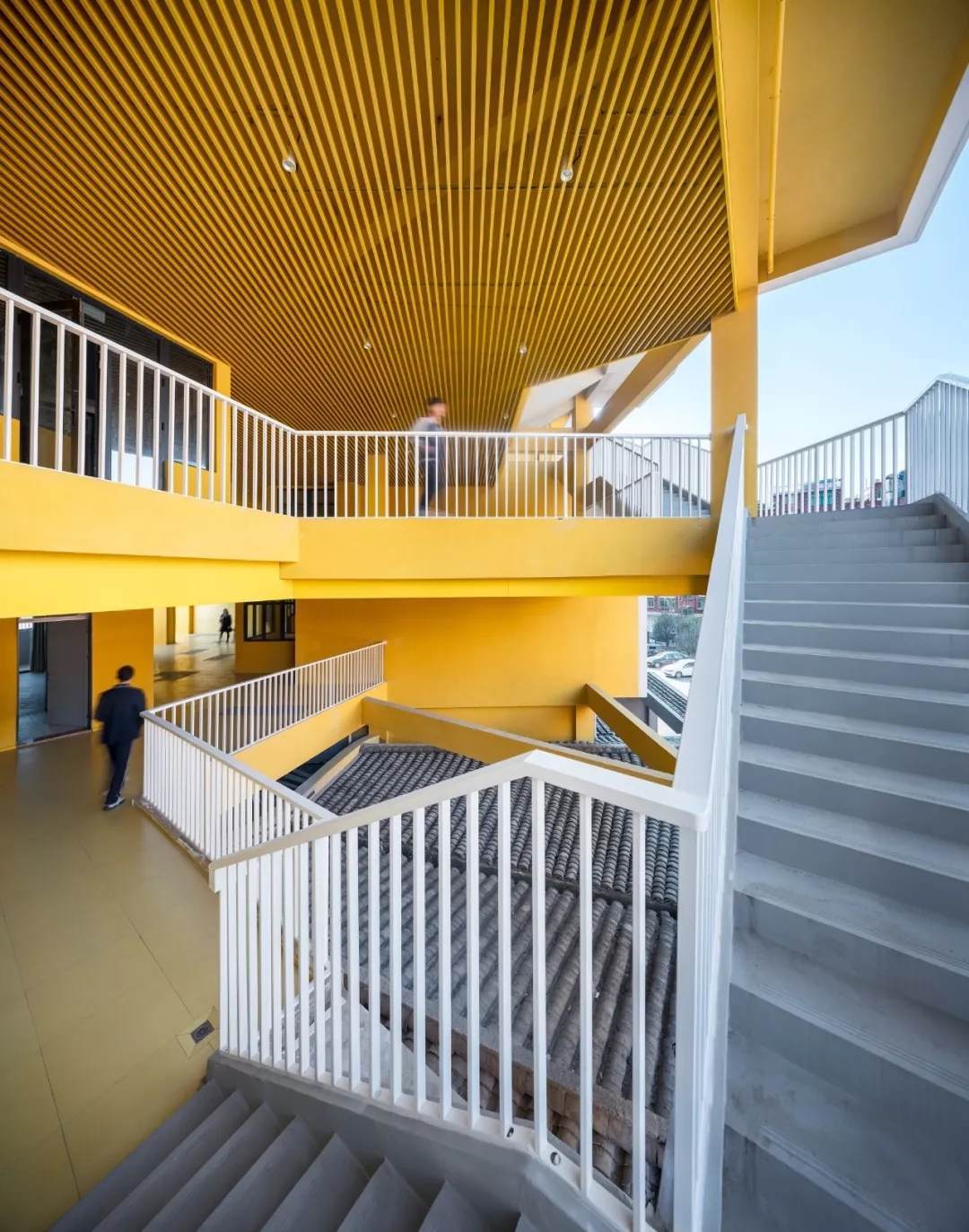 校園內(nèi)的場(chǎng)地東北側(cè)和西南側(cè)的標(biāo)高有著3-4米的高差,屋頂?shù)恼勖媲擅畹慕Y(jié)合了地形,在高差最明顯的地方屋頂與地面相連,使人能夠直接漫步到裙房的屋頂,感受到層層疊疊的瓦片所帶來的時(shí)間沉淀后的痕跡和感染力。材料和形式上的創(chuàng)新設(shè)計(jì)和面向未來的處理手法卻能夠?qū)⑷藥氲奖就粱膫鹘y(tǒng)空間體驗(yàn)。