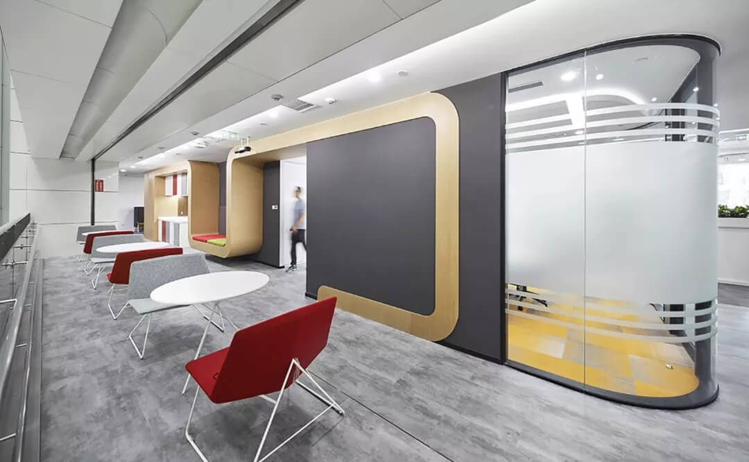 在軟裝設計上,該區(qū)域家具軟裝及墻壁,選擇明快的色調(diào),展示青春活力,并且用黑色烤漆玻璃內(nèi)嵌燈帶的方式營造氛圍,透著數(shù)字化和科技感,表現(xiàn)商湯在數(shù)字時代的不同場景中,所呈現(xiàn)的多元化和創(chuàng)新性。