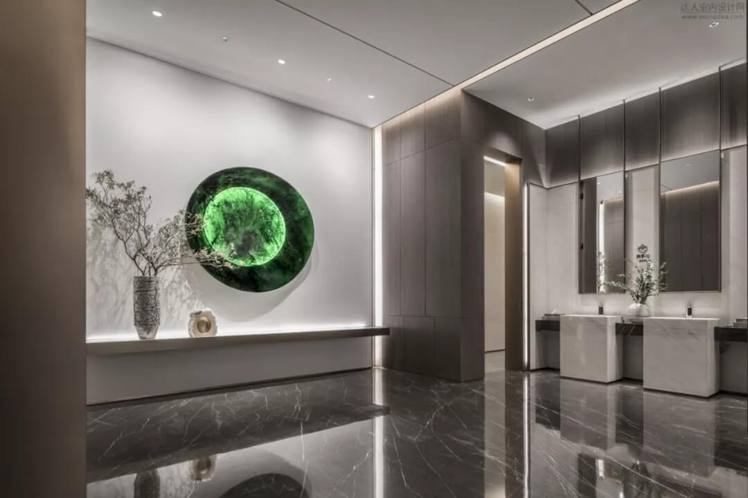 通過(guò)豐富的景觀區(qū)進(jìn)入門(mén)廳,感受到空間的空靈,立面設(shè)計(jì)過(guò)濾了來(lái)自于外界的繁復(fù)。十米挑空的大廳,墻面以米色砂巖為基底,黃銅色金屬?gòu)?qiáng)化縱向的比例,凸顯出空間的氣勢(shì)。入口對(duì)景設(shè)置的水景讓穿梭其中的訪客仿若能傾聽(tīng)到潺潺水聲,同時(shí)水景和懸掛的軟裝裝置相得益彰,充滿巧妙的用意,同時(shí)也分隔了挑高通透的玻璃幕墻,虛實(shí)結(jié)合,體現(xiàn)現(xiàn)代設(shè)計(jì)的東方神韻。