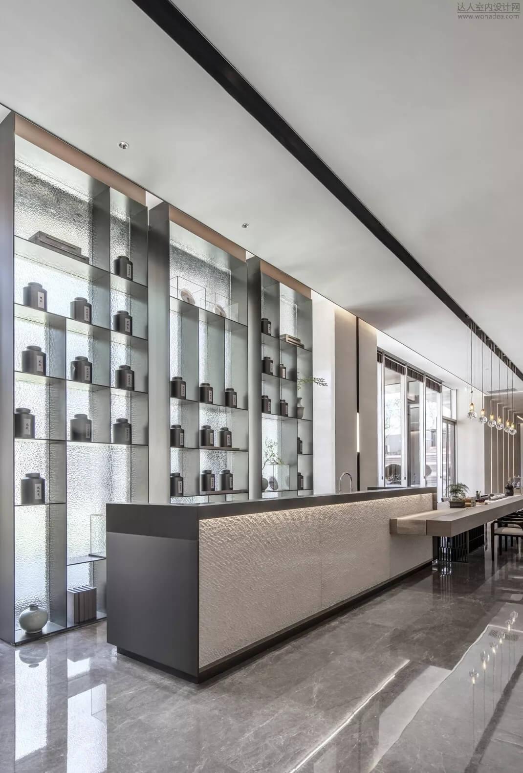 在會(huì)所品茶水吧臺(tái)區(qū)結(jié)合枯山水造景,色彩雅致內(nèi)斂,充分展現(xiàn)了中國(guó)人素來(lái)喜愛(ài)的‘靜’,同時(shí)超長(zhǎng)條的品茶臺(tái),利用下沉庭院的景觀和室內(nèi)產(chǎn)生了互動(dòng),模糊了室內(nèi)外的界限。藝術(shù)儀式感的空間給人帶來(lái)思考的余地。