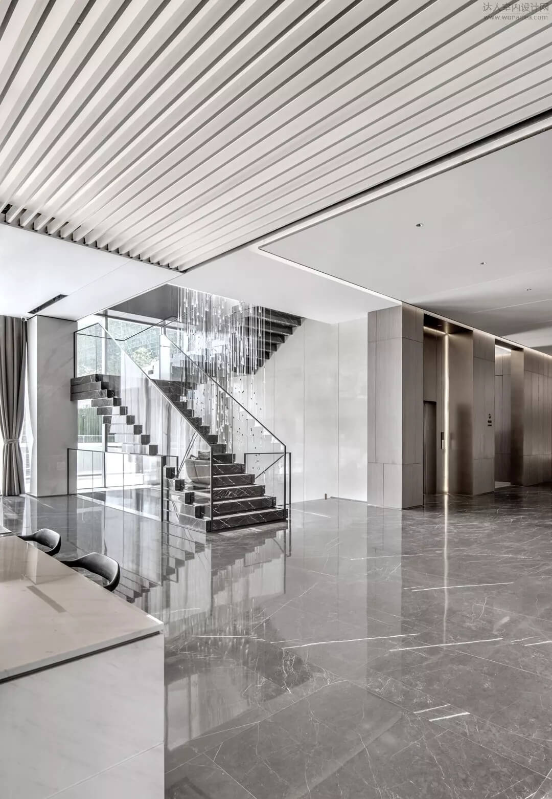 樓梯在空間中不僅是能上下的建筑物,將它打破序列重新解構(gòu),輕盈且厚重,構(gòu)成如雕塑般的能量,讓它成為連接售樓處和會(huì)所的藝術(shù)裝置。樓梯的鮮明特質(zhì)在精心設(shè)計(jì)下顯得非常令人矚目,結(jié)合樓梯下面的水景,讓空間賦有東方意境。