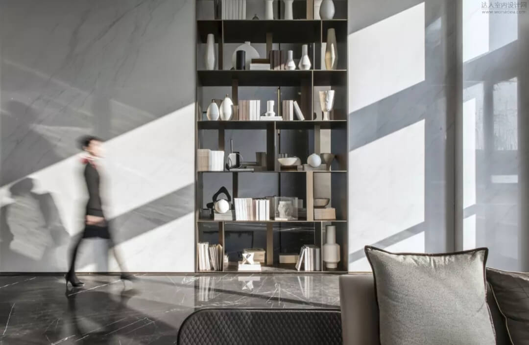 沙盤(pán)區(qū)墻面以大花白陶瓷板為主墻面,通過(guò)通高的黃銅書(shū)架體塊和金屬格柵,本身空間具有很強(qiáng)的中軸對(duì)稱的儀式感,凸顯出空間的大氣。曼妙的波浪曲線,以流動(dòng)的韻律打破空間靜態(tài),同時(shí)從明亮空靈的大堂走入半圍合的沙盤(pán)區(qū),總能給人帶來(lái)新奇感,亦是詩(shī)意與藝術(shù)的格調(diào)升華。