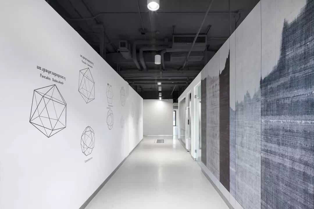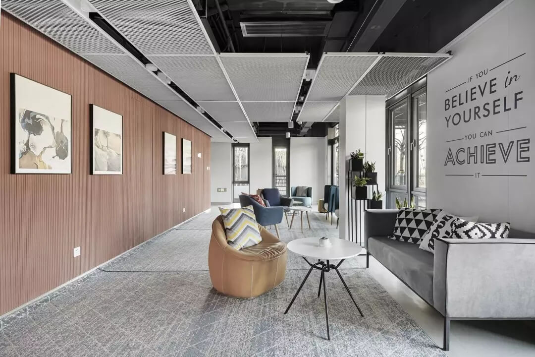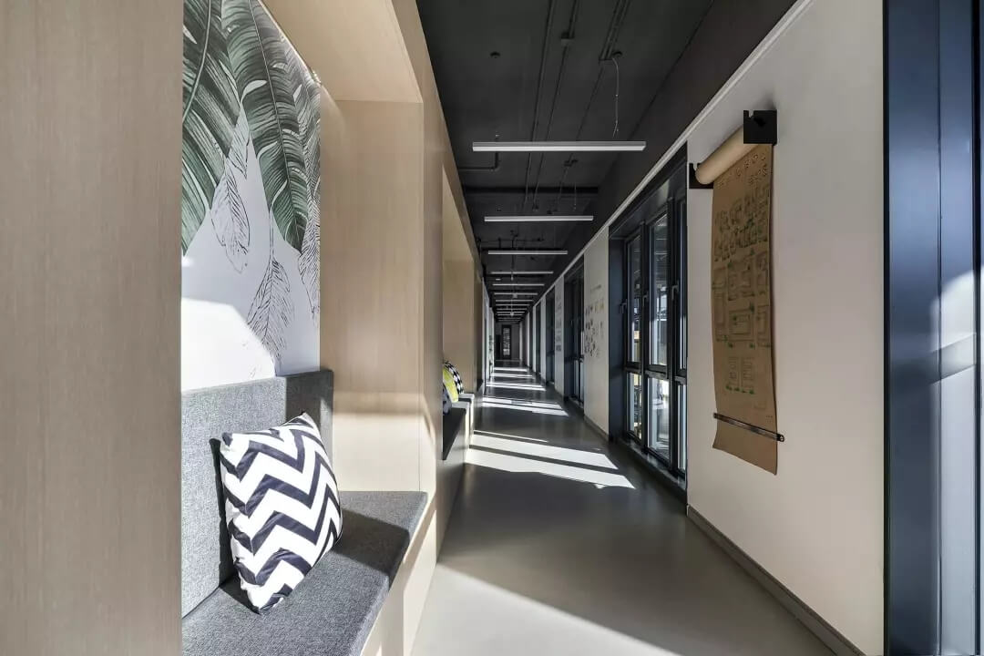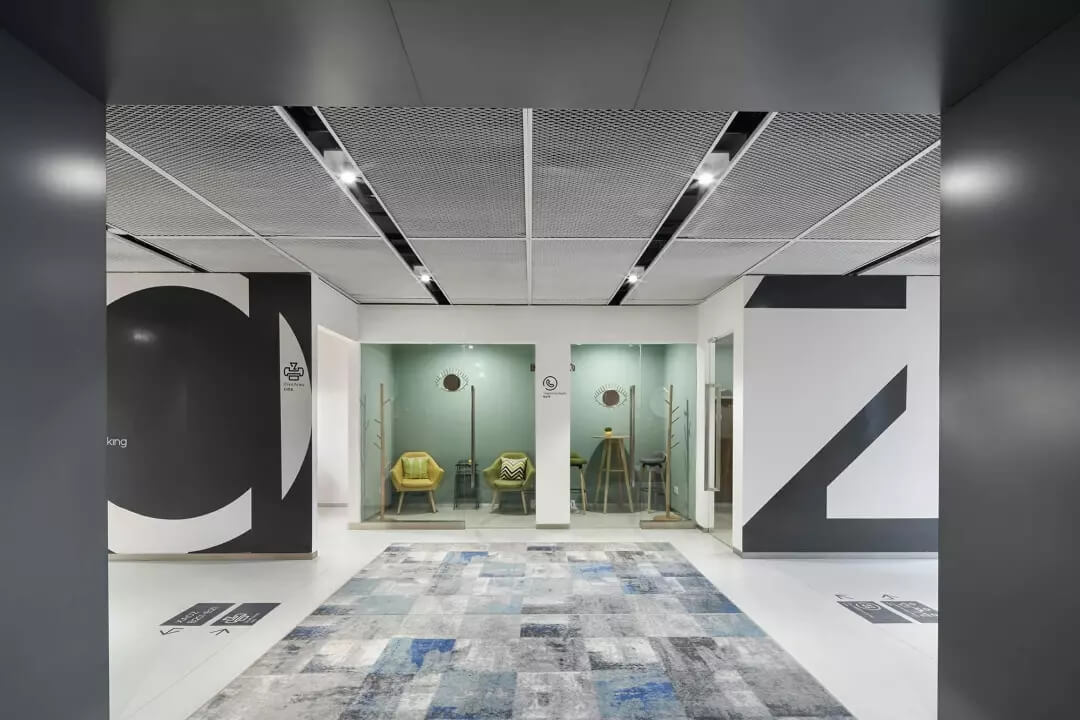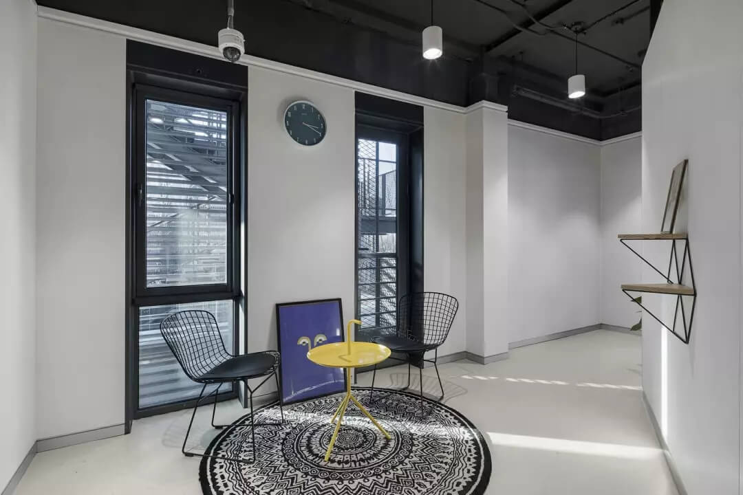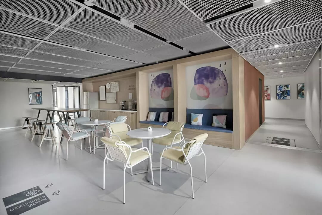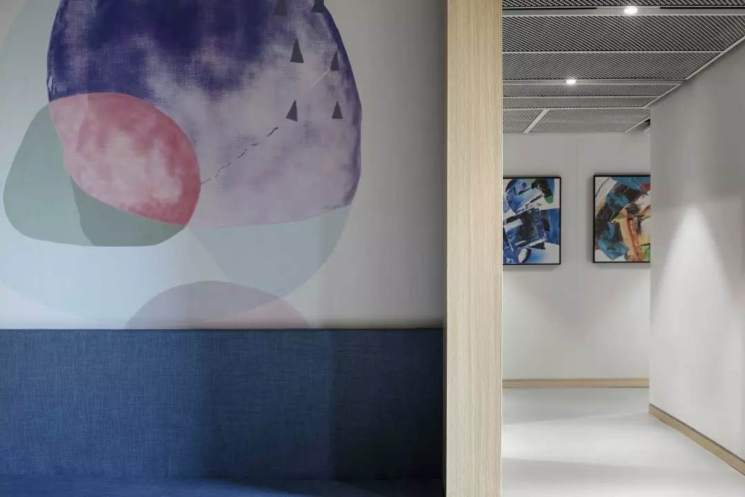 至于盒子以外的空間,我們想凝聚更多的人文藝術(shù)氣息,選擇較多地去鋪陳展示各種抽象的藝術(shù)線條和畫作,同時為了不失去生活氣息,各個角落選擇顏色比較跳躍的家居什物,讓它作為一個流動的戶外廣場,讓人可以自在穿行其中,偶爾停駐觀察,經(jīng)得住人聲鼎沸的喧擾,亦能提供心靈靜憩的安寧。在這里,大家認真辦公、生活、盡情交流、分享,它就是一個安放綠意,有極高包容度的公共空間。
