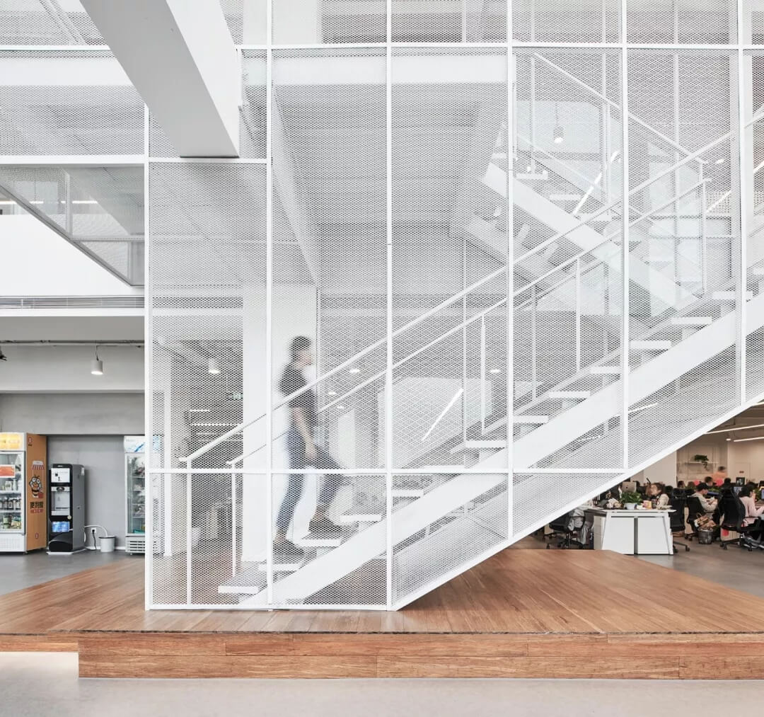 游廊藝谷島,設計師用鋼網(wǎng)構(gòu)筑出具有雕塑藝術感的包裹樓梯空間,通透性的白色鋼網(wǎng),簡單時尚,加強與空間的融合。