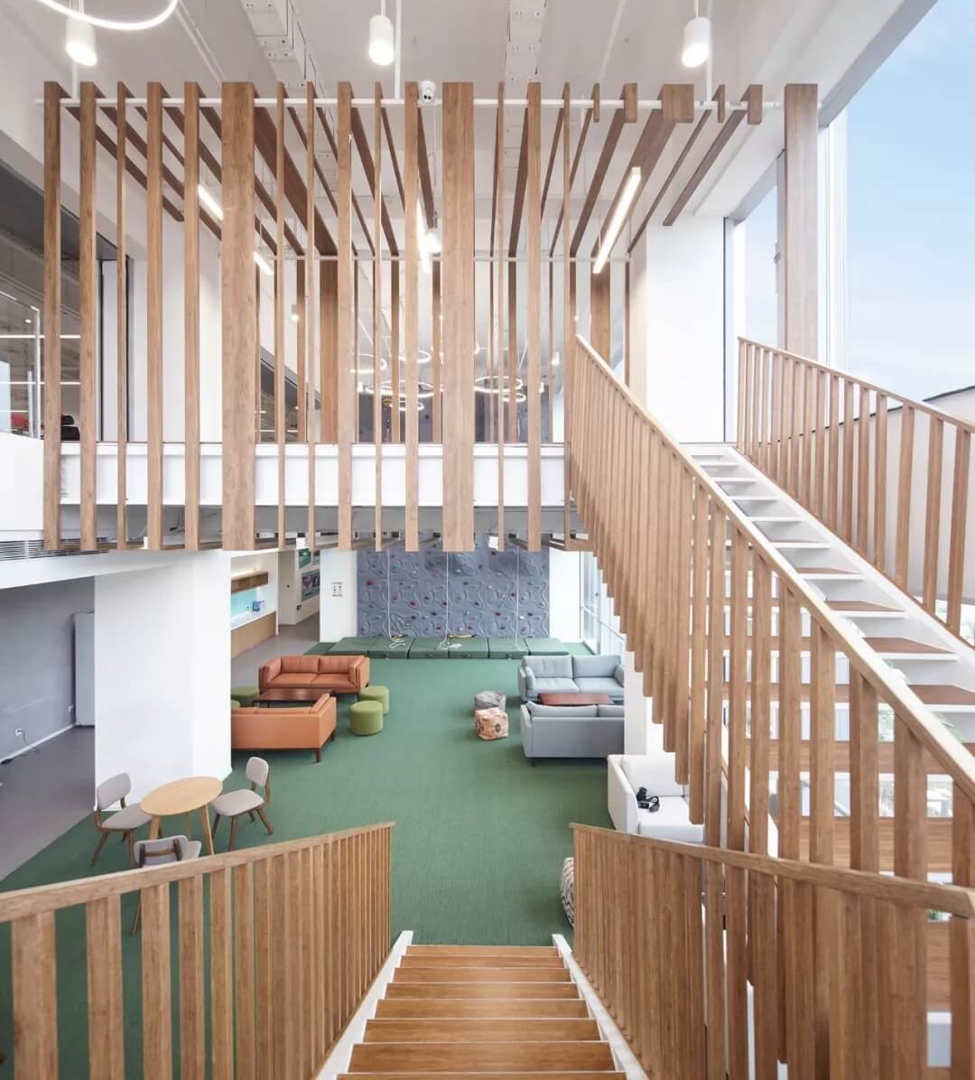 綠籬奇跡島,是自然,健康運動,挑戰(zhàn)自我的主題公共空間。木質(zhì)格柵樓梯在二層延伸出一個通透的格柵BOX,形成豐富的空間層次和視覺高差。同時設置攀巖墻,瑜伽室和健身房,展現(xiàn)新氧人不懼挑戰(zhàn),運動健康的生活方式。