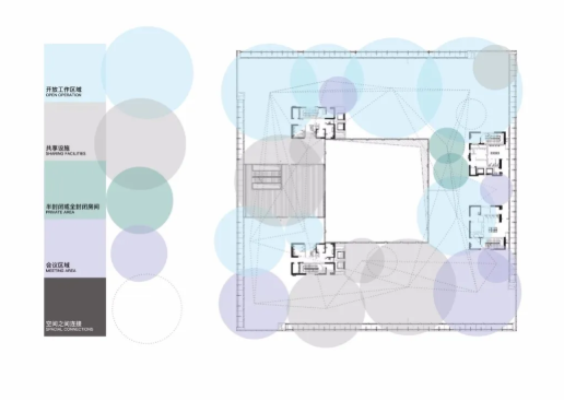該項(xiàng)目的另一個(gè)重要的設(shè)計(jì)出發(fā)點(diǎn)是設(shè)計(jì)師期望將上海這個(gè)城市的活力與多樣性引入并轉(zhuǎn)化為工作空間的功能分布,因此,整個(gè)辦公室中從任意工位出發(fā)走到就近洽談