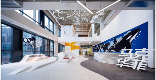 尖端時(shí)尚品牌馬克華菲(Mark Fairwhale)的總部位于上海。該項(xiàng)目基于品牌文化基因,主要運(yùn)用了水與鯨魚的主題元素,并且創(chuàng)造出靈活而又敏捷的工作空間。同時(shí)借此呼應(yīng)其新鮮年輕的風(fēng)格定位。
