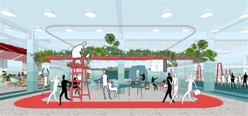 5個公司由一個中間懸掛的“紅環(huán)”聯(lián)系在一起,紅環(huán)上種植蔬菜與植物,下面對應的是跑道。員工在跑道健步的同時可以打電話,也可以與照料植物的同事進行交談。