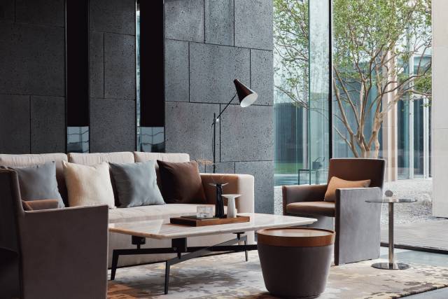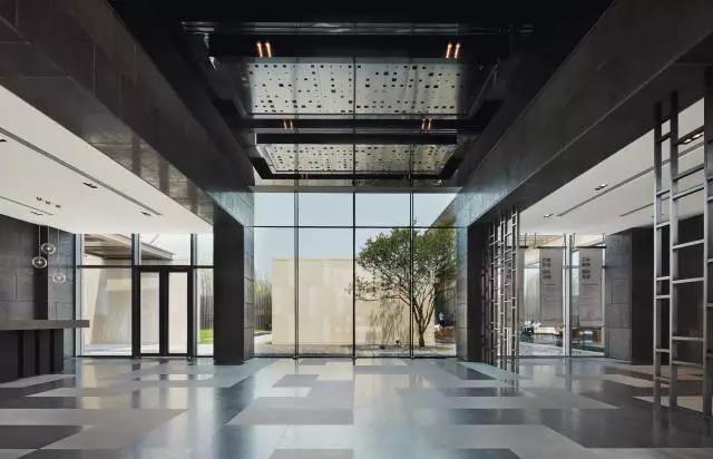 步入大廳,通過“借景”手法,將頗具詩情畫意的東方園林之景鋪呈在眼前,一抹翠綠更是讓整個(gè)空間靈動(dòng)起來,巧妙而又極具視覺沖擊。在陽光照射下,投影又成為景觀的一部分,展示出自然與建筑的互動(dòng),活躍且適宜。一大排落地窗串聯(lián)起室內(nèi)外關(guān)系,正是光線的引入,讓建筑、景觀、室內(nèi)形成有序的一體。沿著預(yù)接待吧臺(tái)的動(dòng)線向前穿引,便是整個(gè)銷控區(qū)域。