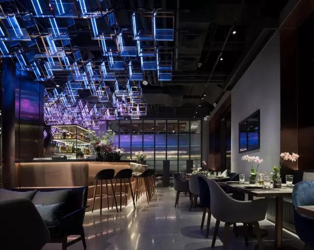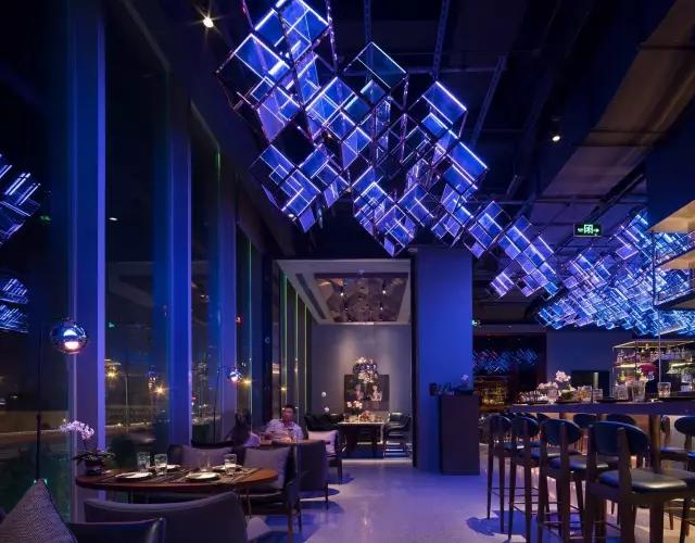 attabj意大利餐廳最美之處便是天頂上的藝術(shù)燈群,設(shè)計(jì)師通過抽象化、藝術(shù)化的手法,將這一感官體驗(yàn)濃縮為空間當(dāng)中的一組裝置,透明亞克力單元體如同酒杯內(nèi)的冰塊,而不斷變幻的LED燈光就像是色彩斑斕的酒體,兩者相互反應(yīng)形成夢幻迷離的光影效果。