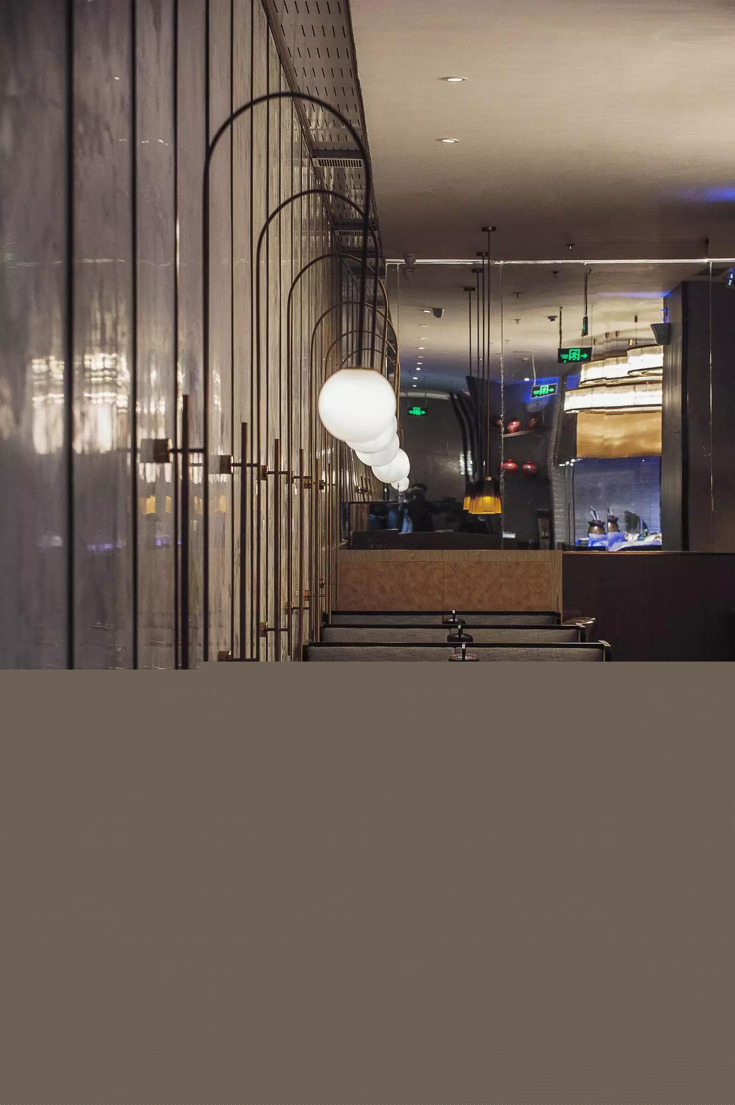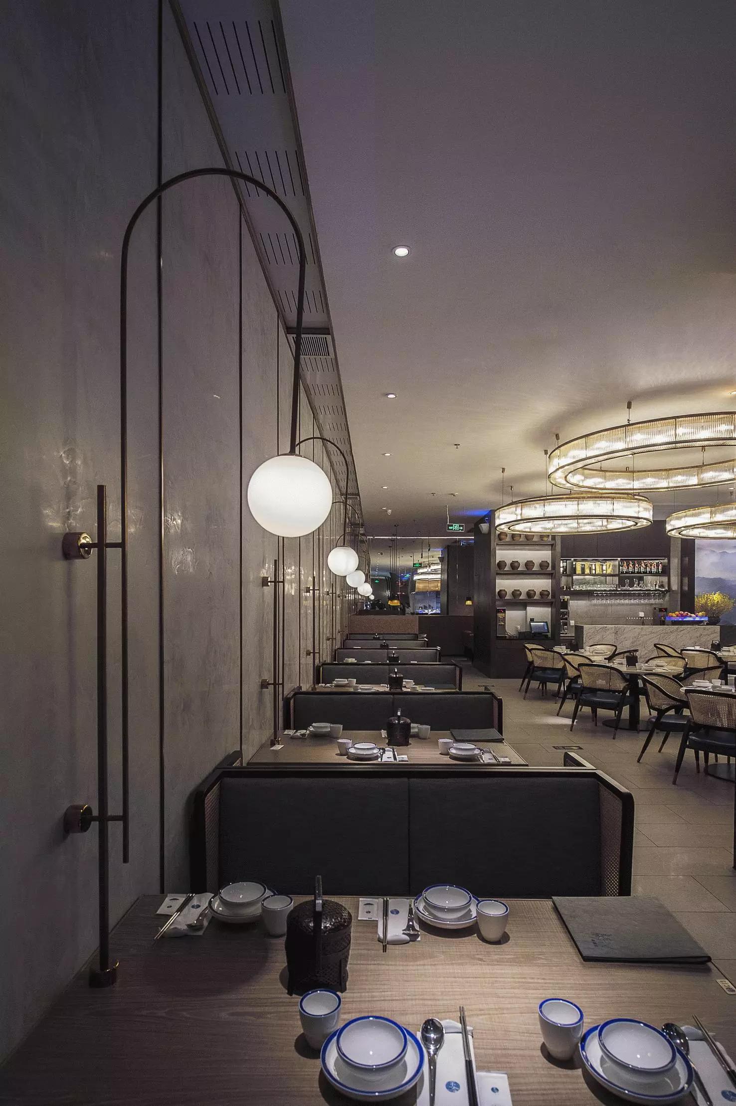 用餐區(qū)完全是一個開放的空間,沒有很多的隔斷,圓桌和方桌有序排布,既充分利用了空間又避免了單調(diào),結(jié)合燈具的設計,就像在老家庭院里的大家庭聚餐——夜晚,歸來的親人們,在清涼的月色中,你來我往,和和樂樂,傳遞此間。