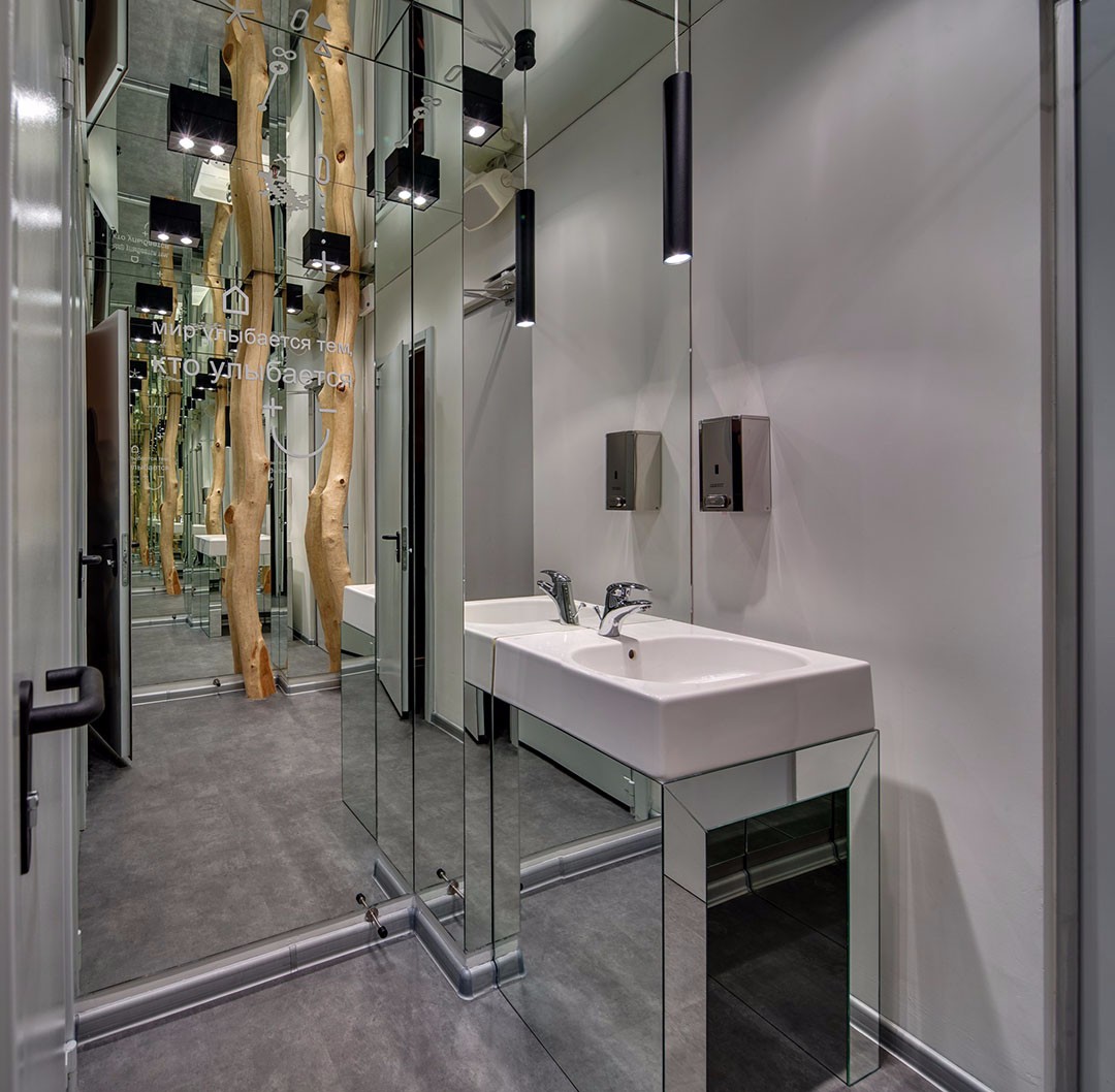 整個(gè)空間共有三層。一層空間將有照明的大型金屬logo面板緊貼玻璃樓梯圍欄設(shè)置,歡迎客人的到來,并通過動(dòng)態(tài)照明來強(qiáng)調(diào)出長接待臺(tái)。